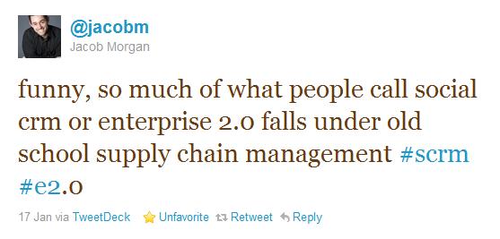 Years ago I was in Supply Chain Management business, and now my startup is developing a SaaS application for businesses, in a #E20 style. That is why I am very curious about Social CRM, SCM and Enterprise 2.0.