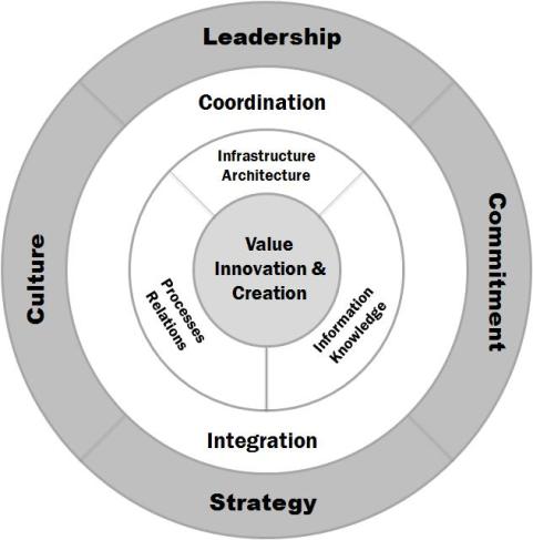 On the outer circle a blend of soft and hard elements: Culture, Commitment, Leadership, and Strategy. The middle circle represents the two main tasks associated with managing business processes: Coordination and Integration. On the inner circle I’ve chosen three set of pairs: Infrastructure & Architecture, Relations & Processes, and Information & Knowledge. All these further having an effect on the ultimate target in the middle – Value innovation and Creation.