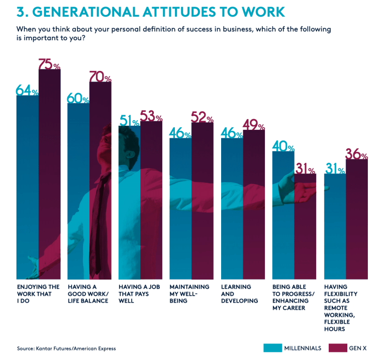 Kantar Futures tutki (American Expressin toimeksiannosta) eri sukupolvien näkemyksiä tulevaisuuden työstä ja organisoitumisesta. Peräti 75% milleniaaleista uskoo, että johtaminen on tulevaisuudessa avointa ja verkostomaista.