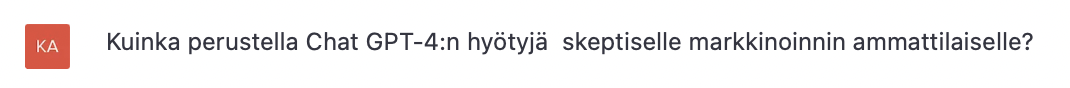Tuosta Suvin saamasta vastaanotosta pikkuriikkisen ärsyyntyneenä kysyin Chat GPT:ltä seuraavasti: ”Kuinka perustella Chat GPT-4:n hyötyjä skeptiselle markkinoinnin ammattilaiselle?”