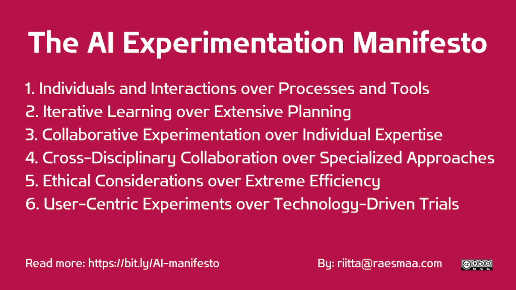 As many organizations struggle with the complexities of utilizing AI, understanding the optimal ways and pace to adapt their working methods is critical. Inspired by “The Agile Manifesto” and my journey of learning AI through hands-on experience, I propose an AI Experimentation Manifesto.