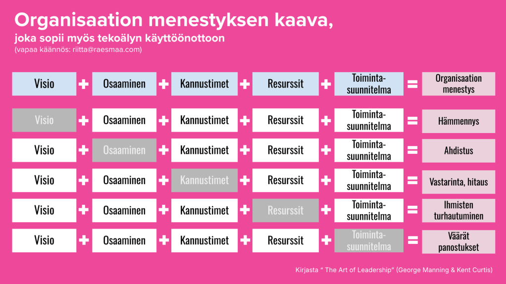 Tämä ”menestyksen kaava” antaa hyvän pohjan tekoälyn tuoman muutoksen johtamiseen, mutta toki se vaatii joustavuutta ja räätälöintiä kunkin organisaation tarpeisiin.
