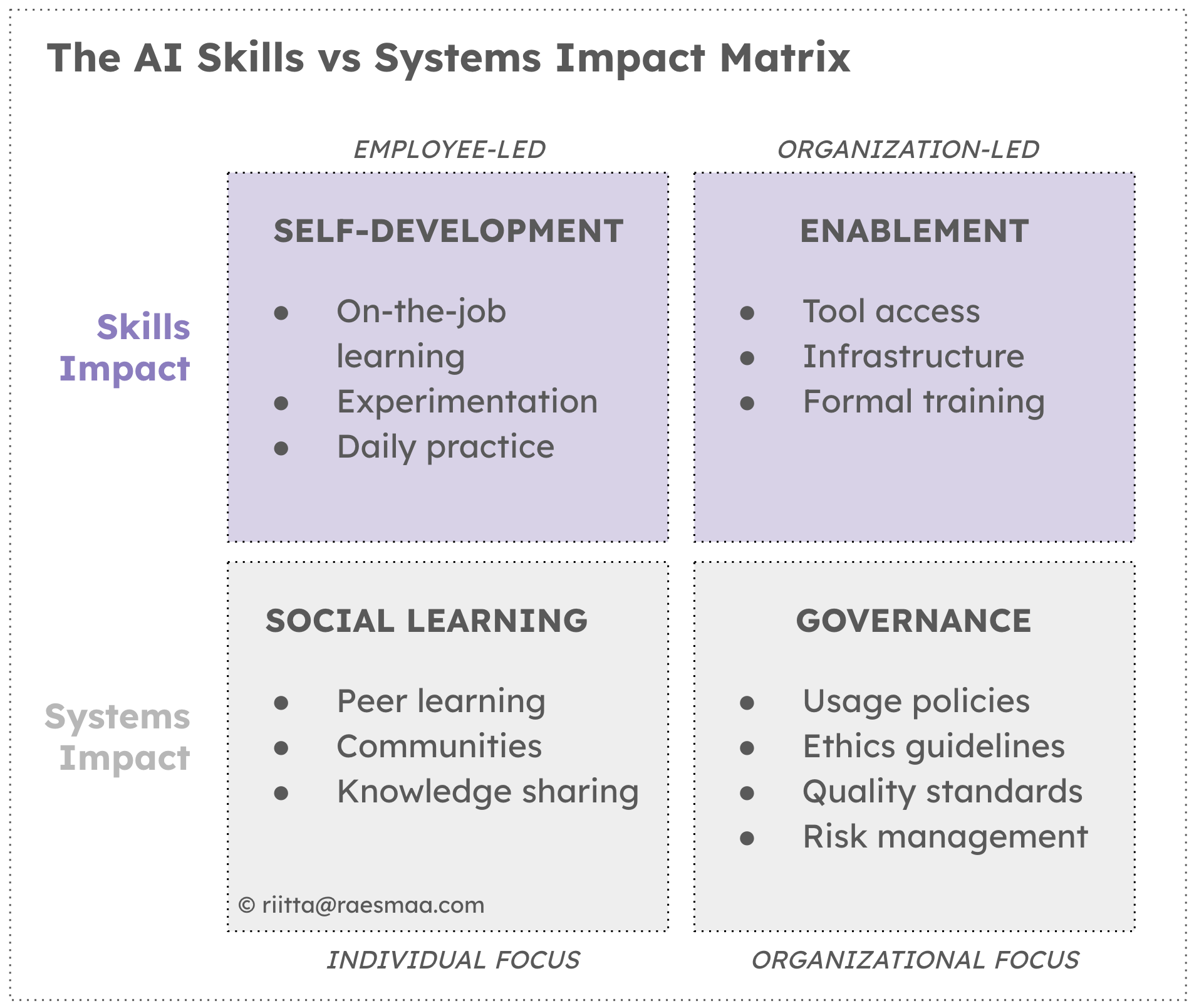 My AI Skills vs Systems Impact Matrix is for managers and HR to balance individual GenAI skill development with systematic organizational support.