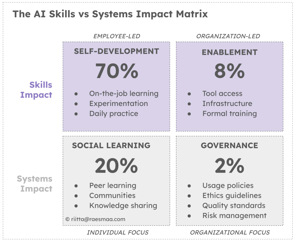 However, in the context of GenAI adoption, I’ve modified these proportions: while keeping 70% for self-development and 20% for social learning, I suggest 8% for formal enablement, and for most organizations, the final 2% acknowledging the critical role of governance in responsible AI adoption. This small but crucial governance component is my addition to this classic model, ensuring that learning translates into responsible and effective AI use while reflecting the unique challenges of AI adoption.