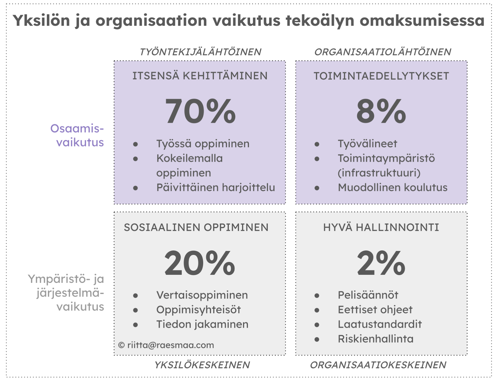 Uskon, että 70 % on edelleen aktiivista itsensä kehittämistä ja 20 % sosiaalista oppimista. Mutta ehdotan, että tuo 10 % jaetaan uusiksi: kahdeksan (8) prosenttia jää muodolliselle koulutukselle ja viimeiset 2 % varataan tekoälyn hyvään hallintotapaan.