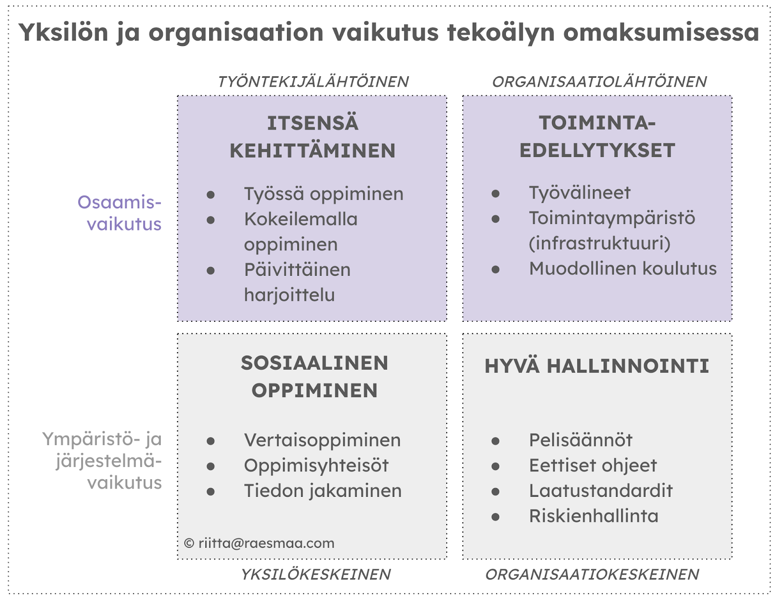 Kehitin tekoälyoppimisen matriisin erityisesti henkilöstöhallinnon ammattilaisille ja kaikille johtajille avuksi ajankohtaiseen pohdintaan: miten organisaatiomme varmistaa, että tekoälyä käytetään hyödyksi ja ilman hurjia riskejä.