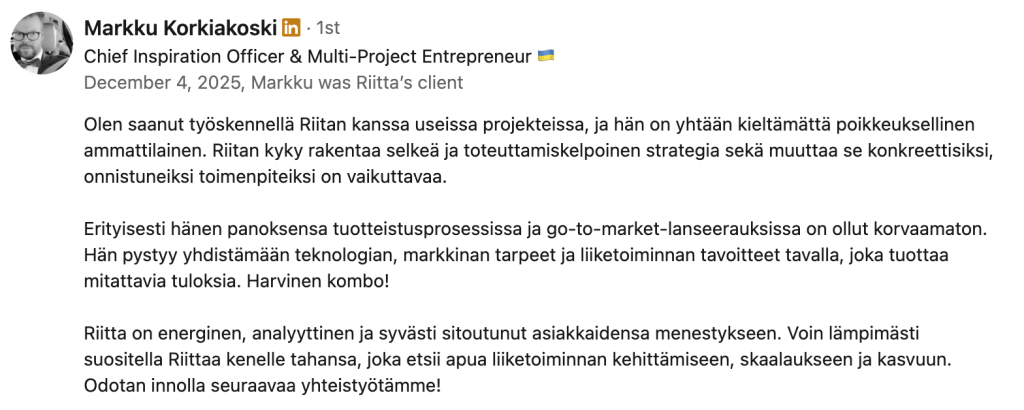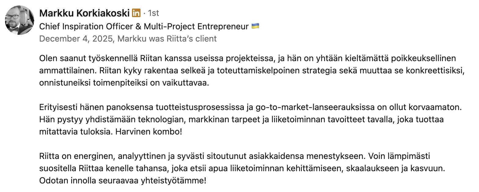 Olen erityisen iloinen saamastani pitkästä suosituskirjeestä. Lue se täältä 👉
